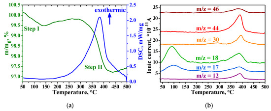 Thermogravimetric analysis (TGA) and mass spectrometry (MS) measurements data for In2O3+RuITP sample are shown in Figure 6. According to TGA, the thermal decomposition process of the sample proceeds in two steps (Figure 6a, green curve). The first decomposition step (Step I) is observed at the range of 35–150 °C, with a weight loss of 0.5%. The second step (Step II) with a weight loss of 2.8% occurs at 290–440 °C. Comparing with mass-spectra signals (Figure 6b) of the CO2 (m/z = 12, m/z = 44), H2O (m/z = 17, m/z = 18), NO (m/z = 30), NO2 (m/z = 46) one can conclude that “Step I” corresponds to the release of physically adsorbed water. “Step II” corresponds to the full exothermic decomposition of the Ru-ITP complex (Figure 6a, blue curve) over 200 °C which led to removal of CO2, H2O, NO, and NO2 from the hybrid material. TGA and MS data for the SnO2+RuITP sample have the same character.