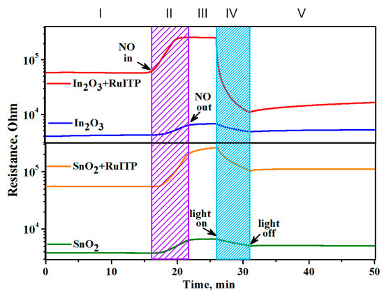 Room temperature resistance of unmodified oxides SnO2 and In2O3 and hybrids SnO2+RuITP and In2O3+RuITP in the presence of 4 ppm NO in dark conditions and under blue light LED illumination (λmax = 470 nm). I—air, dark conditions; II—in the presence of target gas, dark conditions; III—air, dark conditions; IV—air, light illumination; V—air, dark conditions.