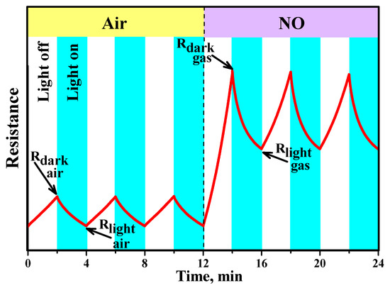 Scheme of changes in the resistance of semiconductor materials under periodic blue light LED illumination (λmax = 470 nm) in pure air and in the presence of NO.