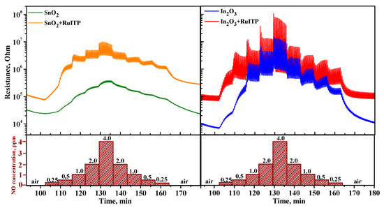 Figure 9 presents the change of room temperature electrical resistances of nanocrystalline oxides SnO2 and In2O3 and hybrid samples SnO2+RuITP and In2O3+RuITP under periodic blue LED illumination during stepwise change of NO concentration. All samples exhibit similar behavior. Under illumination the resistance of the sensors decreases due to the discharge of chemisorbed anions by photogenerated holes following by desorption of adsorbed species. When the diode is switched off, the resistance of the sensors increases due to the chemisorption of oxygen and target gas accompanied by the capture of electrons from the conduction band of the semiconductor [25,26].