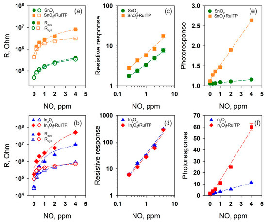 Room-temperature Rdark and Rlight resistance values (a,b), resistive response (c,d), and photoresponse (e,f) depending on NO concentration for SnO2 based (a,c,e) and In2O3 based (b,d,f) samples.