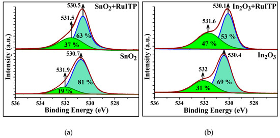 First of all, it should be noted that modification of SnO2 and In2O3 by the RuITP complex leads to a significant (approximately 10-fold) increase in resistance under dark conditions in pure air (Figure 10a,b). To explain this effect, the surface of semiconductor oxides and hybrid materials was additionally investigated by XPS. The oxygen XP-spectra O 1s are shown in Figure 11. In all cases, the O 1s spectra can be deconvoluted into two components. The O(1) component (~530.5 eV) corresponds to the oxygen anions in the crystal structure of SnO2 and In2O3. The O(2) component (531.5–532.0 eV) is caused by the presence of various oxygen-containing species on the surface of materials. Modification of SnO2 and In2O3 with RuITP leads to an increase in the contribution of the higher-energy component O(2) from 19% to 37% in SnO2 based hybrids and from 31% to 47% in In2O3 based hybrids, indicating an increase in the concentration of chemisorbed oxygen on the surface of hybrid materials. Thus, the chemisorption of oxygen with electron capture of the conduction band of the semiconductor oxide (Equation (9)) leads to an increase in the resistance of hybrid samples compared to unmodified oxides SnO2 and In2O3.