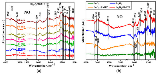 To reveal the influence of RuITP complex on the interaction of semiconductor oxides SnO2 and In2O3 with NO, in situ studies were performed by DRIFTS method. Figure 12a depicts the time evolution of in situ DRIFT spectra at room temperature for In2O3+RuITP sample during NO (50 ppm) exposure. Firstly, during the adsorption process, the adsorbed species accumulate on free sites; almost all bands increased until saturation and then became stable. Some additional peaks were observed in the spectra of the In2O3+RuITP sample because of the more charge carriers (electrons) in the conduction band compared to other samples which leads to greater interaction with the typical Lewis acids. The peaks at 1145–1175 cm−1 and 1220–1240 cm−1 increased as well, indicating there is an accumulation of nitrite species and could be ascribed to corresponding vibrational modes of chelating and bridging bidentate NO2− species [60].
