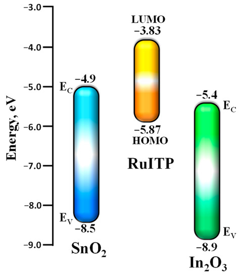 - in the form of powders to investigate optical properties and thermal stability. The RuITP organic dye was dissolved in methanol, and then 10 μL of the prepared solution was added dropwise to the weighed SnO2 or In2O3 powder. The obtained paste was dried at room temperature, the addition of each subsequent portion of the solution was carried out after complete evaporation of the solvent. The concentration of the solution was adjusted so that the Ru content in the hybrid material was 1 wt.%.