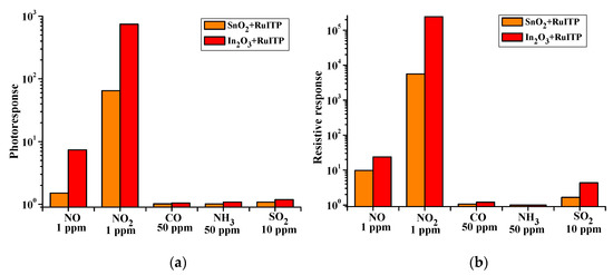 Note that for pure oxides SnO2 and In2O3 there is a decrease in resistance under blue light. The photosensitivity of these materials to light with an energy (E = 2.63 eV) lower than the band gap (Eg(SnO2) = 3.6 eV, Eg(In2O3) = 3.5 eV) is obviously due to the presence of a large number of defects in nanocrystalline materials. This effect was considered in detail in our previous work [27]. Thus, when nitrogen monoxide NO is detected at room temperature, the use of illumination ensures that the electrophysical characteristics of hybrid materials are restored when the target gas is removed from the atmosphere.