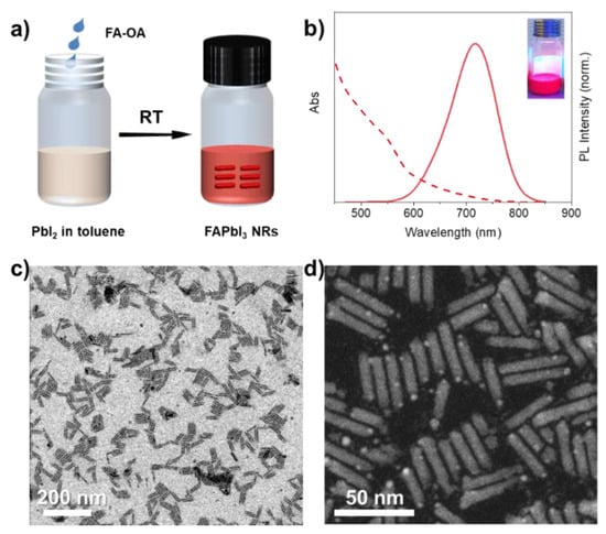 Figure 1a shows the synthetic process of FAPbI3 NRs. The method used here is adapted from our previous publication [16]. In a typical synthesis, 60 µL of formamidine-oleate (0.1 M in OA) was added into 2 mL of PbI2 precursor (0.01 M in toluene with OA and OLA) solution under vigorous stirring at room temperature. After 1 min of stirring, the solution was immediately centrifuged and re-dispersed in toluene for further characterizations. It is worth mentioning that the quality of chemicals is critical for the successful synthesis of perovskite NRs. Absorbing a tiny amount of water by formamidine acetate and toluene could possibly lead to the decomposition of the final product. An impurity of OA or OLA would also result in a low yield of the product, making it difficult to isolate the NRs.