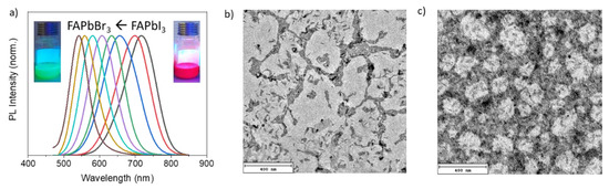 Materials: Formamidine acetate (99%), lead (II) iodide (PbI2, 98.5%), oleic acid (OA, technical grade 90%) were purchased from Alfa Aesar (Karlsruhe, Germany), oleylamine (OLA, 80–90%), toluene (99.85%) were purchased from Acros Organics (Geel, Belgium). OA and OLA were dried for 1 h for further use. All the other chemicals were kept in the glove box and used as received.