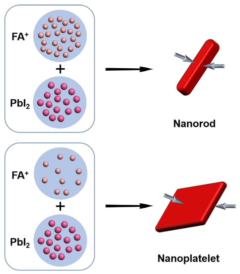 Schematic illustration showing the transformation of precursor-ligand complexes into either FAPbX3 nanorods or nanoplatelets depending on FA concentration because of different surface to volume ratios.