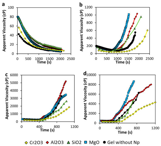Finally, Figure 3d presents the results of gelation time corresponding to the samples prepared with 8000 mg·L−1 of the polymer. We can observe gelation time occurs as follow: Cr2O3 > SiO2 > Gel without nanoparticles > Al2O3 > MgO nanoparticles. Also, as the gelation starts faster than lower concentrations of polymer, the speed of viscosity rising is higher (higher slope), and the maximum viscosity value could reach more than 8000 cP.