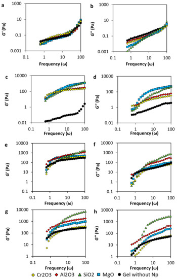 Also, results obtained for gels with 8000 mg·L−1 of the polymer are presented in panels g and h. In general, comparing both Figure 4g,h, it is observed that the G’ is larger than the G” and that the elastic modulus increases with the addition of the nanoparticles, strengthening the 3-dimensional network. However, as G’ increases, G” increases, except for the sample with Cr2O3 nanoparticles in which the elastic modulus does not increase, and the G” decreases at frequencies below 10 ω.