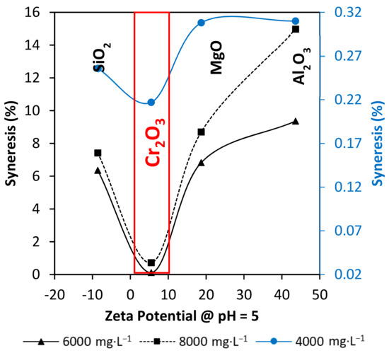 Figure 7 represents the nanoparticles Zeta Potential and the syneresis development relation at the pH of work. The superficial charges of the nanoparticles at pH = 5 is a key parameter to determinate their interaction with the polymer and the crosslinker in the gel. At the test conditions, the closer to the neutral charge states in the nanoparticles surface, the better. In this way, Cr2O3 nanoparticles offer the best scenario to interact with the polymer carboxyl group and the chromium cation (Cr3+). Al2O3 and MgO nanoparticles charged with positive charges may hinder polymer and crosslinker interactions by polymer adsorption without creating a 3-dimensional network. The SiO2 nanoparticles perform similar behavior with negative charges at pH = 5. SiO2 nanoparticles may be repelled with the carboxyl group of the polymer, leading to a weak gel behavior.