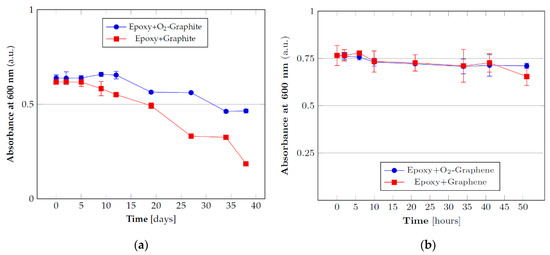 Once identified the best parameters in order to ensure a suitable and durable functionalization, subsequent tests have been conducted in order to evaluate the stability of the resin masterbatches containing functionalized fillers, a critical issue for particulate composites. In other words, the effect of functionalization on filler sedimentation during both masterbatches storage and resin curing have been investigated by UV-visible spectroscopy. In this manner, it is possible to observe the decrease of filler concentration in the resin by measuring the decrease of absorbance over time as a consequence of the sedimentation process. The tests have been carried out with pristine and functionalized graphite/graphene using reference concentrations between those employed for the subsequent tests (specifically at 2% for graphite and 0.05% for graphene). The tests carried out with the graphite in pure resin (Figure 2a) have shown that with plasma functionalization there is a significant difference in stability starting after 5 days or more of storage, which can be good to guarantee extended storage time for the material. This suggests that the functionalization is capable to provide a more pronounced interaction between the filler and the resin, retarding the sedimentation due to the gravity force.