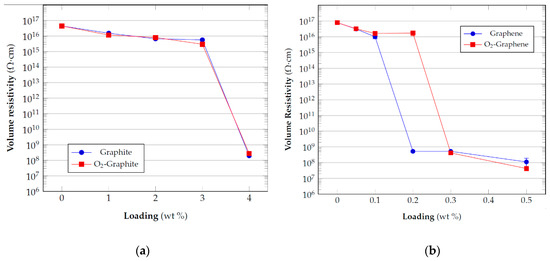 Electrical resistivity of epoxy composites with: (a) graphite and (b) graphene.