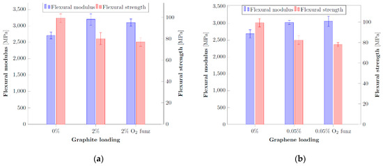 Comparison of the flexural properties for different level of optimal loadings with or without filler functionalization: (a) graphite, (b) graphene.