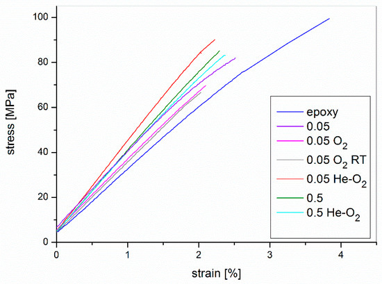 Stress-strain results of flexural tests for pristine epoxy and epoxy/graphene composites treated by plasma functionalization (RT = room temperature).