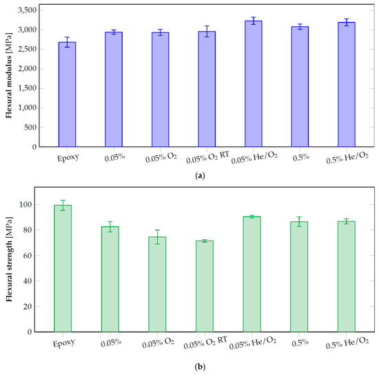 Flexural modulus (a) and flexural strength (b) comparison for pristine epoxy and epoxy/graphene composites treated by plasma functionalization (RT = room temperature).