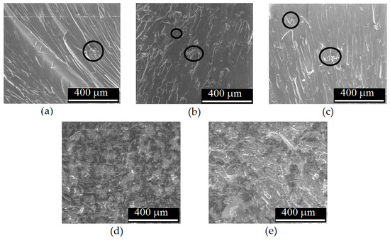 Analyzing SEM images of the brittle fracture surface of the nanocomposites (Figure 9), it can be seen that around the graphene particles in pristine and O2-functionalized 0.05% graphene samples there were some voids (see black circle in the figure), i.e., there was not good adhesion between filler and epoxy matrix, while in the 0.05% He–O2 functionalized sample the filler and the matrix were in more intimate contact, thus leading to a better stress transfer from matrix to filler. For pristine 0.5% graphene samples, the SEM image (Figure 9d) showed very large aggregates while for 0.5% He–O2 sample (Figure 9e) the dispersion was better but there were still several large aggregates which acted as stress concentrators. This can explained why in the mechanical tests the increase from 0.05 to 0.5% of graphene did not lead to any appreciable improvement of mechanical properties and the toughness was lower for higher graphene content.