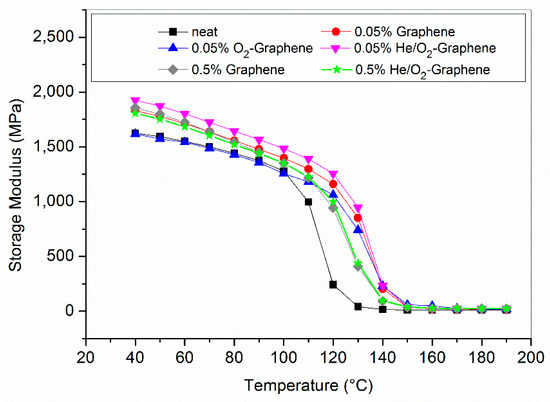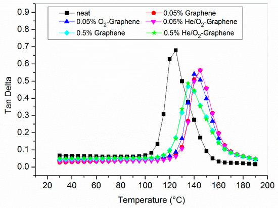 A similar trend can be observed in the case of the storage modulus where, however, for the lower level of filler loading the nature of the functionalization has a different effect on the property of the composite. The plasma functionalization with oxygen does not alter the storage modulus with respect to the value of the neat resin as a remark of the fact that there is a loss in surface hydrophilicity during composite preparation and curing, with a possible modified final interaction between the filler and the matrix. On the other hand, with a He/O2 plasma the effect is completely different and the final storage modulus is higher than that containing pristine graphene thanks to higher interfacial adhesion with the resin promoted by the more thermal stability of the resulted functionalization. In this case, however, the storage modulus is lower at higher concentrations probably due to a balancing of two opposite effects previously postulated in other studies [61,62,63,64,65]: the molecular confinement of the stiff filler and influence on the curing process by the polar groups on the surface of the functionalized graphene. The first determines a restrained mobility of the polymer chains due to the stronger interaction with the filler; this, in turn, implies the necessity of higher thermal energy to activate the cooperative motions related to the glass transition phenomenon. The opposite effect is due to the presence of oxygen rich functionalities on the filler surface that can alter the curing process of the resin. Specifically carboxyl and carbonyl functional group can react with the amine terminated groups of the hardener [66], at the beginning of the curing process, i.e., before the functionalization is partly lost due to high temperature treatment. This last effect reduces the crosslinking density of the final composite, which is reflected in a lower final storage modulus and also lower Tg. Up to a certain level of filler loading, molecular confinement seems to be predominant but above a threshold value the filler could start to negatively interfere with the curing process of the epoxy resin [67].