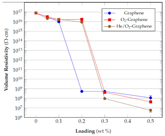 An aspect of interest for the practical applications of particulate composites containing electrical conductive fillers is their volume resistivity. Epoxy resins are excellent electrical insulating materials that normally found applications in coatings and as encapsulation material for electrical and electronic components. The possibility to impart electrical conductivity to these materials combined with their excellent mechanical properties and thermo-chemical resistance potentially opens to the opportunity of their employment in various engineering applications such as antistatic coatings, electrical conductive adhesives, electromagnetic interference shielding materials for electronic devices, thermal interface materials, etc. However, although the functionalization of carbon-based filler represents a potential solution to improve mechanical properties by better compatibility with the embedding epoxy matrix, the effect on the electrical conductivity of the resulting composites is still not clear due to different evidences emerging from studies available in literature [47,48,49]. These differences could be ascribed to several factors among which the type of functionalization could represent an important aspect to take into consideration in terms of better dispersion and surface defectivity. For the present case, the relevance of such analysis is related to the absence of data regarding the effect filler functionalization produced by plasma treatment.