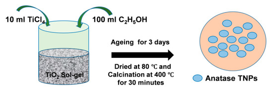 Anatase TiO2 nanoparticles were synthesized by the sol-gel method approach [71]. A total of 10 mL TiCl4 was slowly added dropwise to 100 mL of absolute ethyl alcohol at room temperature. A significant amount of HCl gas was exhausted for the period of the mixing process. A light yellow solution was acquired and accumulated for 3 days to form a gel form of TiO2 nanoparticles. Then, this solution was dehydrated at 80 °C until a dry powder was achieved. The dry whitish powder was annealed at 400 °C with a heating rate of 5 °C/min for 30 min. For studying the effect of annealing temperature on the thermal and mechanical behavior of as-prepared anatase TNPs, the synthesized anatase TNPs were heat-treated at 400 °C, 500 °C, 600 °C, 700 °C, 800 °C, 900 °C, and 1000 °C in a hot furnace at a heating rate of 5 °C/min for 1 h. The samples were named for abbreviation as ANT, with the suffix denoting the heat-treated temperature. For example, ANT400 was the anatase TNP treated at 400 °C, and so on. Figure 1 represents the schematic demonstration of the detailed synthesis process of anatase TNPs using the sol-gel method.