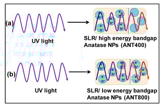 The key mechanism of photopolymerization process assisted by UV light penetration through the (a) stereolithography resin (SLR)/high energy bandgap semiconducting anatase nanoparticles (NPs) (ANT400) and (b) SLR/low energy bandgap semiconducting anatase NPs (ANT800). The energy/intensity of UV rays reduced (the violet color lines indicate higher intensity and red color lines indicates lower intensity) when it underwent deep penetration through the resin composites.