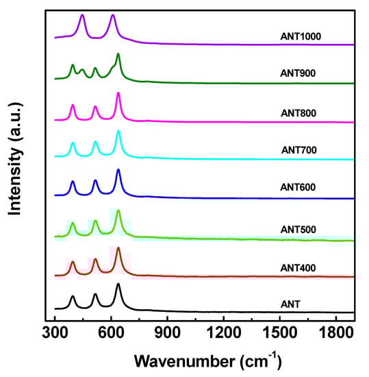 In addition to XRD, Raman spectroscopy was also used to investigate the structural identification of thermally treated anatase TNPs samples. The Raman spectrums of TiO2 polymorphs were unique enough, and were beneficial for distinguishing the various TiO2 phases. Figure 4 represents the Raman spectrum of as-prepared anatase TNPs annealed at different temperature samples. According to Figure 4, the Raman active modes, where the vibrational spectrum centered around 394.7, 514.6, and 639.8 cm−1, corresponded to the anatase phase, and the vibrational modes around 447.8 and 608.7 cm−1 represented the rutile phase [78]. The analysis of the Raman spectra of the sample annealed at 800 °C revealed high intensity, which was proof of high crystalline with a complete pure anatase phase. Further calcinations led to a gradual phase transformation from anatase to rutile. Both anatase and rutile vibrational modes were observed in the sample annealed at 900 °C, and after subsequent annealing at 1000 °C, the Raman spectra denoted that the phase had been completely transformed to rutile phase. The phenomena were noted and matched with the XRD analysis (Figure 3) study as well.