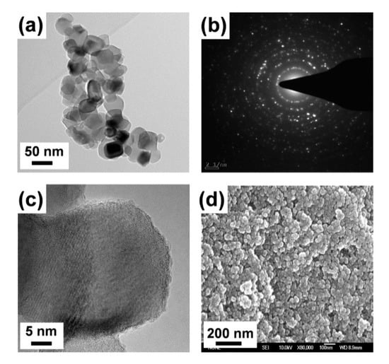 (a,c) High-resolution transmission electron microscopy (HRTEM) image of ANT800 NPs. (b) Selected area diffraction pattern (SAED) of ANT800 NPs. (d) Field emission scanning electron microscope (FESEM) image of ANT800 NPs.