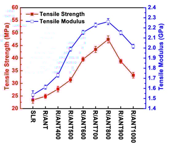 For better understanding of the effect of reinforced nanofillers within the SLA resin on the mechanical properties, the complete dataset of elastic modulus and tensile strength is demonstrated in Figure 6 and Table 1. The correlation graph revealed that the tensile strength and elastic modulus of the 3D printed neat SLR was the lowest compared to the SLR/nanofillers nanocomposites. However, the SLR/nanofillers nanocomposites reinforced by the anatase TNPs without annealing (R/ANT) possessed the lowest tensile strength and elastic modulus, which indicated that the annealing treatment can effectively improve the mechanical properties of the SLR/nanofillers nanocomposites by the induced photopolymerization through the enhanced catalytic activity of annealed anatase TNPs. From the graphs, as the annealing temperature increased, the tensile strength and elastic modulus increased gradually up to 800 °C, which showed that, at 800 °C, annealed anatase TNPs were showcasing high crystalline structure and low energy bandgap, which led to better mechanical properties. In the case of increasing annealing temperature (more than 800 °C), the tensile strength and elastic modulus were noted as being remarkably decreased. Moreover, the 3D printed samples of R/ANT800 showed the efficient mechanical strength among all the other samples, with an improvement of 103% in tensile strength and 32% in elastic modulus, compared to the neat 3D printed SLR.