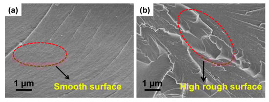 FESEM images of the fractured surface of tensile strength-tested 3D-printed samples: (a) neat SLR and (b) R/ANT800.