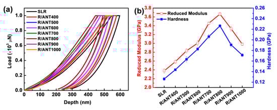 The analysis of the micro-mechanical properties (reduced modulus and hardness) of the neat SLR and SLR/nanofillers 3D printed specimens was performed with the assistance of nanoindentation analysis. Figure 8a, demonstrating the micro-mechanical analysis of the as-obtained nano-indentation results, shows that, with the addition of annealed anatase, TNPs were able to reduce the indentation depth remarkably. Conversely, with the loading of increasing annealing temperature of anatase TNPs, decreasing indentation depth of SLR/nanofillers was observed, especially at the loading of anatase TNPs annealed at 800 °C, showing shallow indentation depth, compared to all other annealed anatase, which was far better than the neat SLR sample. Moreover, Figure 8b, shows the extracted results of reduced modulus and hardness of the 3D printed samples of neat SLR and SLR/nanofillers. According to Figure 8b and Table 2, the reduced modulus and hardness of SLA resin gradually increased with an increasing annealing temperature of anatase TNPs. However, as the temperature of anatase TNPs increased up to 800 °C, expressing an increasing trend, a later sudden decrement of reduced modulus and hardness was noted, whereas the annealing temperature increased beyond 800 °C. The 3D printed sample of R/ANT800 showed a measured value of reduced modulus (3.66 GPa) and hardness (0.22 GPa), which were 54.4% and 69.2% higher than the neat SLR (2.37 GPa for reduced modulus and 0.13 GPa for hardness), respectively. As per our earlier discussion in this paper, the anatase TNP annealing temperature increased up to 800 °C, there were no phase changes, and high anatase crystalline phase was observed, but when the annealing temperature went beyond 800 °C, the treated anatase TiO2 started phase change from anatase to rutile. The obtained results clearly reveal that the anatase phases of TiO2 nanoparticles can remarkably increase the micro-mechanical properties of SLA resin matrix [81].