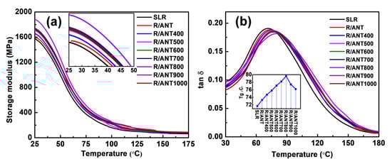 Thermo-mechanical analyses of neat SLR and SLR/nanofillers 3D printed samples. (a) Storage modulus and (b) tan δ curves. The inset in (a) shows the enlarged view of dynamic mechanical analysis (DMA) curves at a horizontal axis between 25 °C and 50 °C, and the inset in (b) shows the observed glass transition temperature (Tg) of different samples from the tan δ curve.