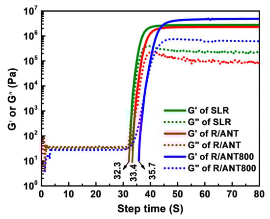 A UV LED accessory of DHR-2 was performed to examine the curing behaviors of pristine SLR, SLR/ANT, and SLR/ANT800 nanocomposite matrix. The instrument can be recorded as the variations in storage modulus (G’) and loss modulus (G”) of the nanocomposite resin in the course of the curing process by the fast sampling process. Figure 10 demonstrates the curing behaviors of neat SLR and SLR containing 1% w/w of ANT NPs (without heat treatment) and 1% w/w of ANT800 NPs (heat-treated at 800 °C). For the UV-instigated photopolymerization and interconnection, the nanoparticle filler affected the gel time in two contradictory features: (1) the reinforcing effect of nanoparticles may endorse the interconnection between the monomers and oligomers to enhance the modulus of resin matrix, hence reducing the gel period; (2) the nanofillers may obstruct the light, hindering photopolymerization, and thus extending the gel period [82]. Figure 10 shows that the accumulation of anatase TNPs lengthened the gel time a slight amount, but the increased storage modulus was noted as compared to pristine SLR. Herein, the sample of R/ANT800 showed the best storage modulus (refer to the solid blue lines in Figure 10). However, its gel time was increased, initially owing to the nanoparticles hindering the UV light from penetrating far through the resin, though the excellent storage modulus was achieved through the outstanding dispersion and lower bandgap energy, which led to better mechanical property enhancement. In addition, from Figure 10, it can be observed that the SLR/nanofillers composites had a delay in the starting curing time, as compared to neat SLR in the photocuring reaction. This delay was due to the aggressive absorption of UV light by the photoinitiators or nanofillers composites [83].
