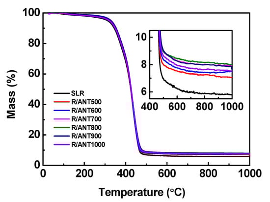 In order to describe the thermal stability of the neat SLR and SLR containing different annealed anatase TNPs, thermo gravimetric analysis was utilized, and the resulting graph is shown in Figure 11. With reference to Figure 11, the residual char weight of neat SLR (5.83%) is shown [84], and an increasing trend was observed during the addition of annealed anatase TNPs, especially in the loading of ANT800 (8.14%), which showed a better increment of residual char value, then decreasing for further annealed sample reinforcement. Earlier research reports that the incorporation of anatase TiO2 nanoparticles could possibly enhance the thermal stability of polymer matrixes [85]. The aforementioned interpretations propose that the advanced thermal stability with a lower decomposition rate was found in the sample R/ANT800, though at a higher temperature the defect solidity in high crystalline anatase phase was observed [86]. The key factor for the residual char enhancement was due to the lesser defect solidity with intensifying the calcinations temperature of anatase TNPs and enriched cross-linking between anatase TNPs and the SLR matrix at high temperature.