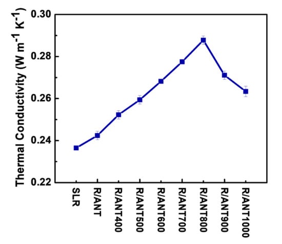 Figure 12 demonstrates the thermal conductivity measurements of the SLR and SLR/nanofillers 3D printed samples. According to Figure 12, the addition of anatase TNPs with SLR could improve the thermal conductivity of a 3D printed structure. The better enhancement over thermal conductivity was distinguished with the incorporation of annealed anatase TNPs up to 800 °C, and a deprived trend was observed with annealed temperature beyond 800 °C. The enhanced thermal conductivity of R/ANT800 sample (0.2878 W/m K) was about 22% of the increment compared with the neat SLR (0.2365 W/m K). The better thermal conductivity of SLR was achieved through the incorporation of high crystalline anatase phase, which was attained at the annealing temperature of 800 °C. However, the earlier literature study reported that the addition of anatase TNPs to the polymer composites showed superior thermal conductivity compared with the addition of rutile or a mixture of both TNPs, owing to its small particle size and high crystalline structure of anatase TNPs [87]. Here, the smaller particle size (Figure 5a) and high crystalline anatase phase structure (Figure 3) of ANT 800 NPs led to achieving excellent dispersion within the SLR matrix, which helped to attain better improvement of thermal conductivity of the R/ANT800 sample.