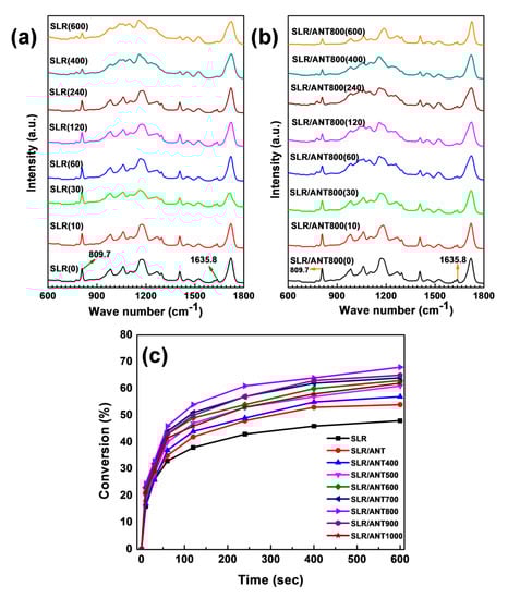 A real time FTIR analysis of photopolymerization of neat SLR and SLR/ANT800. (a) Neat SLR and (b) SLR/ANT800 nanofillers composite in different periods of UV irradiation time intervals starting from 0 s to 600 s. (c) Percent conversion graph of neat SLR and SLR/nanofillers.