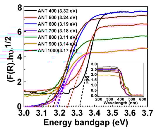 Tauc’s plot for an indirect bandgap model (Kubelka-Munk function) and UV-visible diffusive reflectance spectra (inset) of annealed anatase TNPs. The dash-dot lines represent line tangent towards the point, where the line intersected the horizontal energy axis (bandgap). The observed bandgap of controllably annealed anatase TNPs is mentioned in brackets, followed by the sample name.