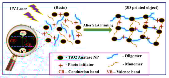 Herein, this work emphasizes the generosity of innovative harmonization of nanotechnology and 3D printing technology, which have led to a technological revolution in this era, producing vast promises in science and engineering. In the present work, we synthesized nanosized anatase TiO2 particles via sol-gel process followed by treatment of different calcinations to develop a novel initiator for the photopolymerization of acrylic-urethane resin under UV irradiation. From our research study, it was revealed that these heat-treated anatase TNPs expose different crystalline and phase (anatase and rutile) transitions during different calcinations temperatures. There are many research studies that have reported that the bandgap tuning effects are due to vacancy cluster transformation within the TiO2 structures [67,68,69,70]. However, there are no works reported that involve the bandgap tuning of TiO2 nanoparticles through studying the assistance of temperature. Here, we report a novel study approach, showing that treatment by different temperature-assisted anatase TiO2 nanoparticles can initiate as well as enhance the photopolymerization of methyl methacrylate (MMA) and polyurethane in organic systems in the presence of atmospheric O2 under UV light irradiation. Also, the introduced TNPs can recruit O2 in the polymerization mechanism to avert inhibition of the initiating free radicals. In addition, these incorporated TNPs can be easily detached from the polymer combination and reprocessed without any substantial deterioration in the photocatalysis activity. The different temperature-assisted semiconducting TNPs underwent various phase transformations, bandgap energies, and crystalline sizes. Conversely, the nano-based incorporated TNPs helped in achieving better dispersion and allowed the UV lights to penetrate to maximum depth through the resin, which led to enhancement in the photopolymerization process. However, the anatase TNPs that incorporated SLA 3D printed objects revealed better mechanical and thermal properties through the enhanced photopolymerization by the achievement of excellent dispersion of introduced nanofillers within the polymer matrix.