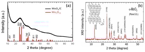 XRD pattern of (a) Mo5O14/C composite compared with the diagram of Mo5O14 as reference [] and (b) crystalline a-MoO3 (orthorhombic structure).