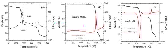 TGA and DSC curves of the MoO3 synthesis (a) and as prepared P-MoO3 (b) and Mo5O14/C composite (c) recorded at heating rate of 10 °C min−1.