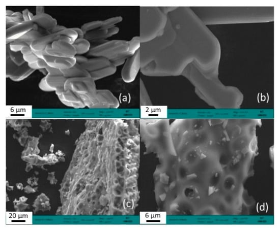 The morphology of the Mo5O14/C composite was analyzed by scanning electron microscopy and compared with that of pure MoO3 synthesized from the same precursor (Figure 3). While the SEM images (a,b) of P-MoO3 show uniformly distributed and well-developed packed platelets of the layered α-MoO3 structure, the SEM images (c,d) of the Mo5O14/C composite display a honeycomb carbon matrix with small pores, and irregular particles of molybdenum oxide are dispersed inside the matrix.