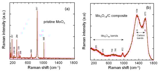 Since XRD experiments are not efficient tools to determine the structure of ill-crystallized materials, we investigated the short-range local structure of Mo5O14/C composite using Raman spectroscopy. Figure 4 compares the Raman patterns of the pristine MoO3 (a) and the Mo5O14/C composite (b). The Raman spectrum of Mo5O14/C composite prepared at 500 °C in argon atmosphere can be considered as the sum of the Mo5O14 and carbon contribution. In the low-frequency region, the spectrum shows features of the molybdenum oxide phase, while the high-frequency range (greater than 1200 cm−1) displays the fingerprint of the carbon matrix. Note that the weak intensity of Mo5O14 Raman pattern is due to the presence of carbon environment absorbing the scattering light. The five low-frequency Raman bands located at 972, 780, 700, 430 and 225 cm−1 can be identified as the vibrational patterns of tetragonal Mo5O14. The Mo-O stretching mode appears at 972 cm−1, the Mo-O-Mo bridging modes are recorded at 780, 700 and 430 cm−1, while the deformation modes of the Mo-O bonds appear at ca. 225 cm−1. This deformation mode was observed at 229 cm−1 in Mo4O11. It should be noted that this Raman spectrum definitely differs from those of either α-MoO3 (Figure 4a) or Mo4O11 phase [,]. For example, in the spectrum of Mo5O14, the broad peak at ~780 cm−1 replaces the sharp peak of α-MoO3 at 820 cm−1, which reveals the presence of sub-stoichiometric MomO3m−1 crystals. Such a blue shift of the stretching mode is attributed to the modification of Mo-O bonds induced by the reduction of Mo6+ to Mo5+ next to the oxygen vacancies []. Nazri and Julien [] showed that the intensities and positions of vibrational bands of MoO3·nH2O are extremely sensitive to small changes of the Mo-O polyhedra. A loss of the translational symmetry is expected because of the oxygen vacancies present in the MomO3m−1 lattice. Thus, the highest stretching mode appears at 996 cm−1 in MoO3, while it is shifted to 985 cm−1 in Mo4O11. The Hardcastle–Wachs approach allows to correlate the Raman shifts with the Mo–O bond distances []. The stretching at 972 cm−1 observed in the Raman spectrum of Mo5O14 appears at the same frequency as that of MoO3·nH2O with a Mo-O distance of 1.687 Å against 1.671 Å for anhydrous α-MoO3. The broad bands observed in the range 1200–1600 cm−1 correspond to the D- and G-bands of carbon. The D-band at 1354 cm−1 is associated with the disorder-allowed A1g zone-edge mode of graphite, whereas the G-band centered at 1573 cm−1 corresponds to the optically allowed E2g zone center mode of crystalline graphite. The broadening of the G- and D-bands are characteristics of localized in-plane sp2 domains, and disordered graphitic-like carbon, respectively. The peak intensity ratio ID/IG of approximately 1.19 confirms the low degree of graphitization of the carbon matrix and the small size of the graphitic domains La of about 4.8 nm according to the empirical equation La (nm) = 4.4 ID/IG []. The limited graphitization is due to the low temperature used for the preparation of the composite (i.e., 500 °C), but seems enough to be beneficial for electron transport from/to the semiconducting Mo5O14 active material.