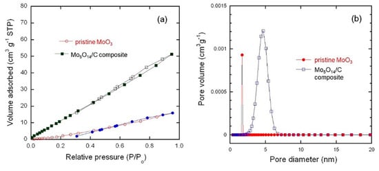 Figure 5 shows the nitrogen adsorption–desorption isotherms and pore-size distributions (PSD) for both P-MoO3 and Mo5O14/C composite. The uptake of nitrogen adsorption of both samples increases gradually with the increase of relative pressure (Figure 5a). Note that the quantity of nitrogen adsorbed for the Mo5O14/C composite is much larger than that of P-MoO3 sample. The adsorption rises noticeably at low relative pressures of less than 0.5, indicating that micropores are present. Instead of reaching a plateau, the uptake of nitrogen further increases with relative pressure until P/P0 approaches unity, which suggests that a substantial amount of external surface area was created in Mo5O14/C sample. As shown in PSD curves (Figure 5b), the distribution of the pore diameters has peaks at 4.8 nm for Mo5O14/C composite. The Mo5O14/C composite exhibits a broader pore-size distribution with the pore diameter in the range 2−7 nm. It has been widely reported that physical and chemical activation of carbon materials help to open and widen the microporosity even with a conversion to mesopores [,]. The material porosity, i.e., pore size distribution and pore volume, has been quantitatively evaluated using the Barrett–Joyner–Halenda (BJH) method []. Results are listed in Table 1 and show that the BET surface area, the BJH total pore volume and the porosity are higher in Mo5O14/C than in P-MoO3. The increase of the specific surface area is attributed to the presence of 26 wt.% carbon. The higher pore size in the Mo5O14-type/C composite also favors better electrochemical performance of the electrode.