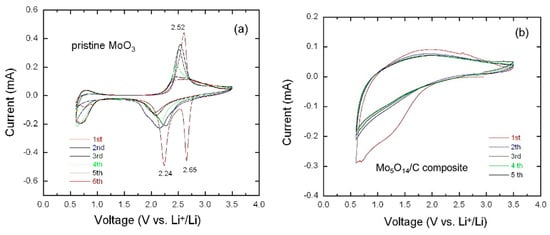 The cyclic voltammetry (CV) behavior for pristine MoO3 and Mo5O14/C composite electrodes performed in the potential range 0.6–3.5 V vs. Li+/Li at the scanning rate of 0.05 mV s−1 are displayed in Figure 6a,b, respectively. The choice of the low voltage cut-off of 0.6 V was intentional because of the formation of metallic Mo and 3Li2O, which takes place as a plateau at around 0.4–0.5 V upon further Li+ insertion [,]. The CV curves of pristine MoO3 exhibit well-defined redox peaks, due to the fact that this material is well-crystallized. In the first cycle, there are two strong cathodic peaks at ca. 2.7 and 2.3 V, with one reversible anodic peak around 2.6 V. The cathodic peak at 2.7 V is irreversible and disappeared after the first lithiation during subsequent cycles (Figure 6a). Such a behavior has been evidenced by preparing pre-lithiated LixMoO3 samples using the chemical insertion by LiI in the range 0.1 ≤ x ≤ 1.0. For x ≈ 0.49, the CV curve displays only one reversible redox couple that is an indication of the disappearance of the pure α-MoO3 phase with similar patterns for subsequent cycles []. The mesoporous Mo5O14/C composite reveals a featureless voltammetry response over a broad potential range; this pattern arises from its amorphous-like structure, which leads to numerous insertion sites for Li+ ions. After the first cycle, a high reversibility is observed from overlapping CV curves (Figure 6b.)