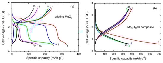Figure 7a,b present the galvanostatic charge-discharge (GCD) profiles of the pristine MoO3 and Mo5O14/C composite electrodes, respectively, recorded at C/10 rate (70 mA g−1). In a fresh cell, pristine MoO3 and Mo5O14/C composite are electrodes in a “charged state” with all Mo ions with the 6+ oxidation state. Thus, the first process of lithiation occurs during discharge (reduction of Mo to 5+ and 4+ states) providing a capacity Q. During the subsequent charge Q’, Mo is oxidized, but not all Li ions can be extracted from the lithiated phase, thus less electrons are transferred and Q’<Q. Definitely, the electrochemical behaviors of these electrodes are different. The difference between the shape of charge/discharge curves of pristine MoO3 and Mo5O14/C is mainly due to the difference in the structure and morphology of the active material. In contrast with the 2D structure of α-MoO3, Mo5O14 has a 3D structure with empty site in the tunnels inducing a different Gibbs energy that results in unlike voltage profile. In addition, the voltage profile of an amorphous material is a S-shape curve due to the random distribution of the available site in the framework.