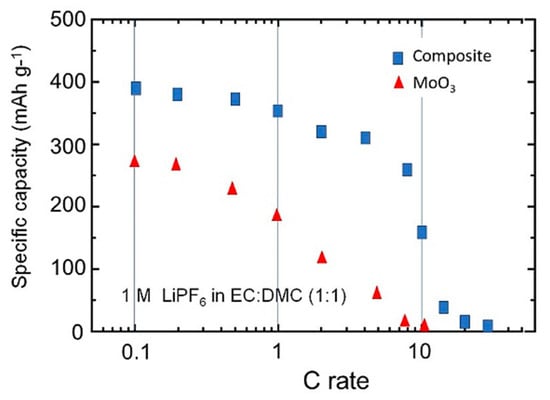 However, MoO3 and MomO3m−1 lithiated oxides suffer from a large volume expansion (about 104% for MoO3). During Li+ insertion, pulverization of the cathode occurs at a potential of less than 1.5 V and disconnection from the current collector. As a result, the electrochemical performance is poor []. Different strategies can be used to improve the cyclability as follows. Nanosized MomO3m−1 particles were prepared with low crystallinity [,]. Blended hybrid was fabricated []. Composites with addition of an electronically-conductive carbonaceous materials were synthesized [,,,,]. The carbon has two beneficial effects: it opposes the aggregation of the active particles and it accommodates the volume change of electrode material during cycling []. Different synthesis techniques were used to fabricate MoO3/C composites: electrospinning method [], hydrothermal route [,,,], template method [], spray pyrolysis [] and ball milling [].