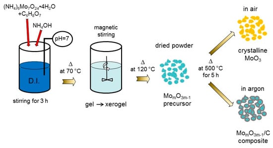 Overall synthesis process of the crystalline MoO3 and MomO3m−1/C composite.