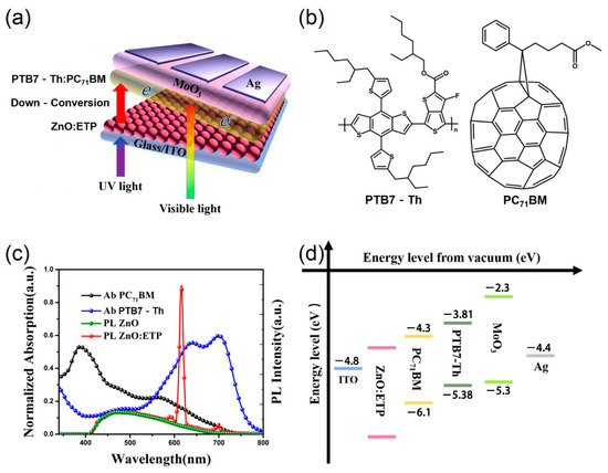 (a) Schematic illustration of the device architecture in this work. (b) The molecular structure of polymer PTB7-Th and PC71BM. (c) Absorption spectra of the neat PTB7-Th and PC71BM films and photoluminescence (PL) spectra of ZnO and ZnO/Eu(TTA)3phen (ETP). (d) Energy level diagram of the components of the device.