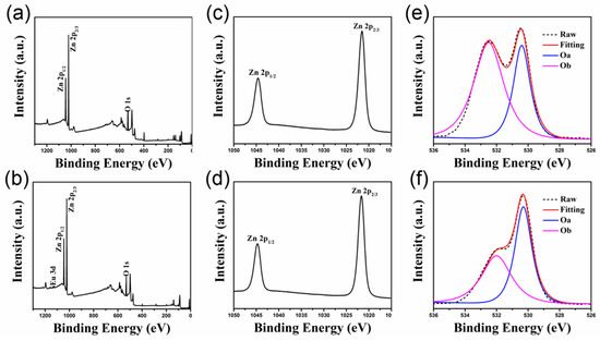 X-ray photoelectron spectroscopy (XPS) spectra of ZnO and ZnO/ETP films (a,b) survey scan, (c,d) Zn 2p spectra, and (e,f) O 1s spectra of ZnO and ZnO/ETP films.