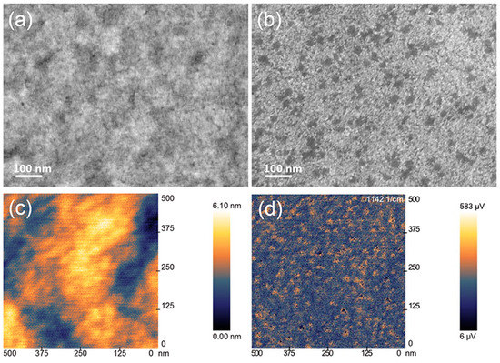 In Figure 3a,b, we use SEM to investigate the surface morphology of ZnO film and ZnO/ETP blend film spin-coated on the ITO substrates. The SEM image of pure ZnO is a homogeneous film. However, from the SEM image of the ZnO/ETP blend film, it can be observed that some of the smaller dark regions are evenly distributed in the light region. Figure 3c,d provide the topography and photo-induced force microscopy (PiFM) image of the ZnO/ETP blend film, respectively.