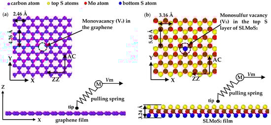 Graphene consists of an isotropic hexagonal honeycomb lattice of carbon atoms. SLMoS2 consists of a 2D hexagonal honeycomb lattice where the Mo layer is covalently sandwiched between the bottom S layer and the top S layer. The vertical distance between two S layers of SLMoS2 is approximately 3.24 Å. The atomistic models of monovacancy-defective graphene and SLMoS2 are achieved by constructing a defect-free monolayer film first and then introducing the monovacancy defect in the center of the surface/top layer, as shown in the inserts in Figure 1a,b. In the adopted Cartesian coordinate system, the X-axis is set along the zigzag (ZZ) direction, the Y-axis along the armchair (AC) direction, and the Z-axis normal to the graphene and SLMoS2. The sliding was applied by moving the tip along the zigzag (ZZ) on the center line of the monovacancy-defective graphene and SLMoS2. The areas of the graphene and SLMoS2 film were 76.26 × 62.48 Å2 and 166.23 × 142.59 Å2 in the X–Y plane, respectively. The single-atom tip was generated for the atomic-scale friction according to the PT model, which consisted of a single carbon atom and was set as a rigid body in order to avoid the mass loss caused by the tip wear during the atomic-scale friction process. The constant-force mode is applied in the model and the loading force on the tip is kept at 2.5 nN. The schematic diagrams of the atomic-scale friction of monovacancy-defective graphene and SLMoS2 are shown in Figure 1a,b, respectively.